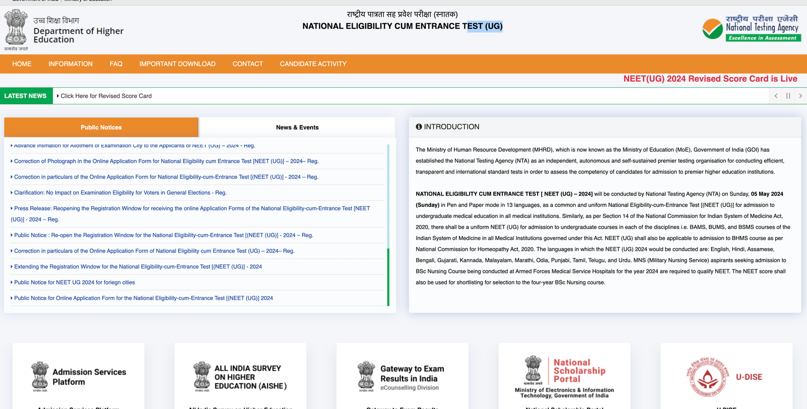 - Public Notice: नीट (यू जी) – २०२४ परीक्षा के आयोजन के संबंध में। (The organization of NEET (UG) – 2024 exam , 5 May2024
