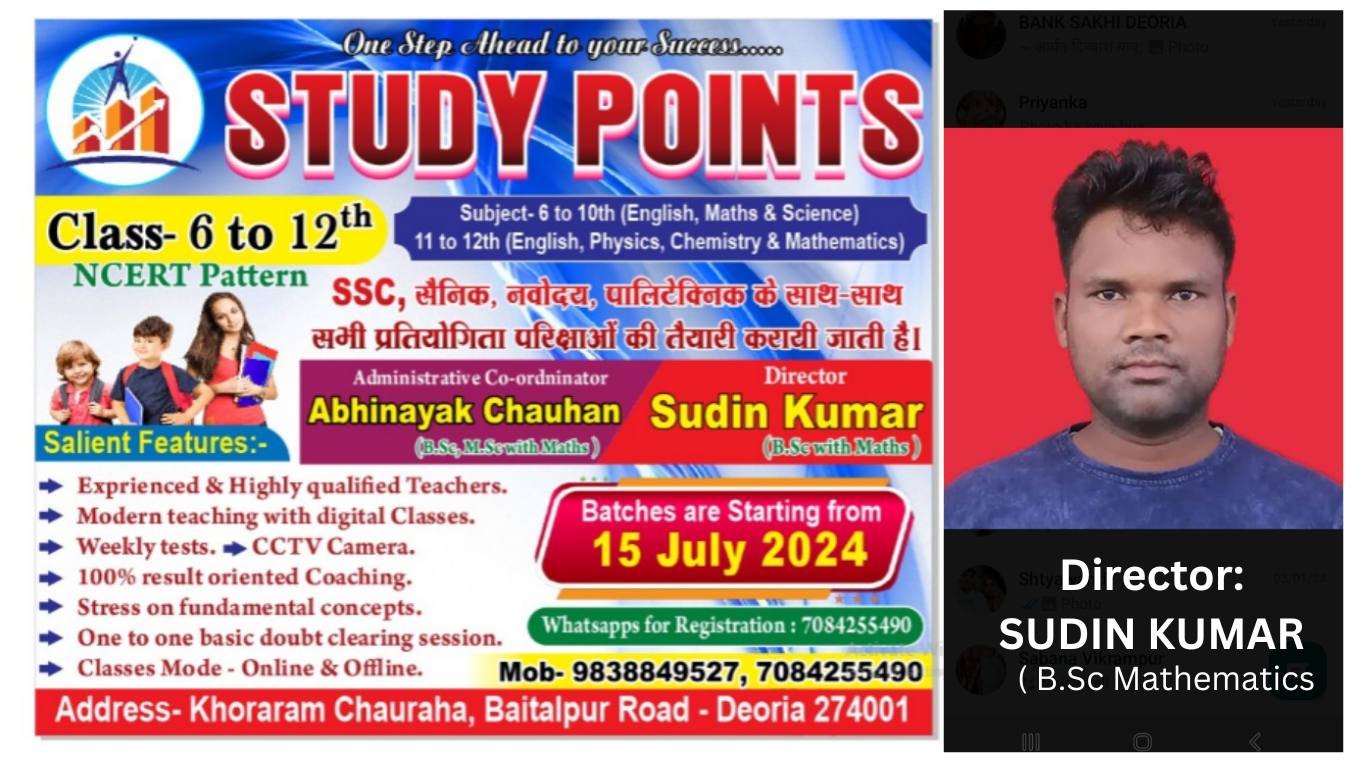 26 जुलाई, 2024 खोराराम चौराहा, देवरिया – शैक्षिक उत्कृष्टता में एक प्रमुख नाम, स्टडी पॉइंट ट्यूटोरियल ने कक्षा 6 से 12 तक के छात्रों के लिए अपने नए डिजिटल शिक्षण समाधान और परीक्षा तैयारी कार्यक्रम शुरू करने की घोषणा की है। इन नवीन पेशकशों में मुख्य विषय ट्यूटोरियल और शामिल हैं प्रतियोगी परीक्षाओं के लिए विशेष कोचिंग, सभी अत्याधुनिक डिजिटल बोर्ड प्रौद्योगिकी द्वारा उन्नत।
